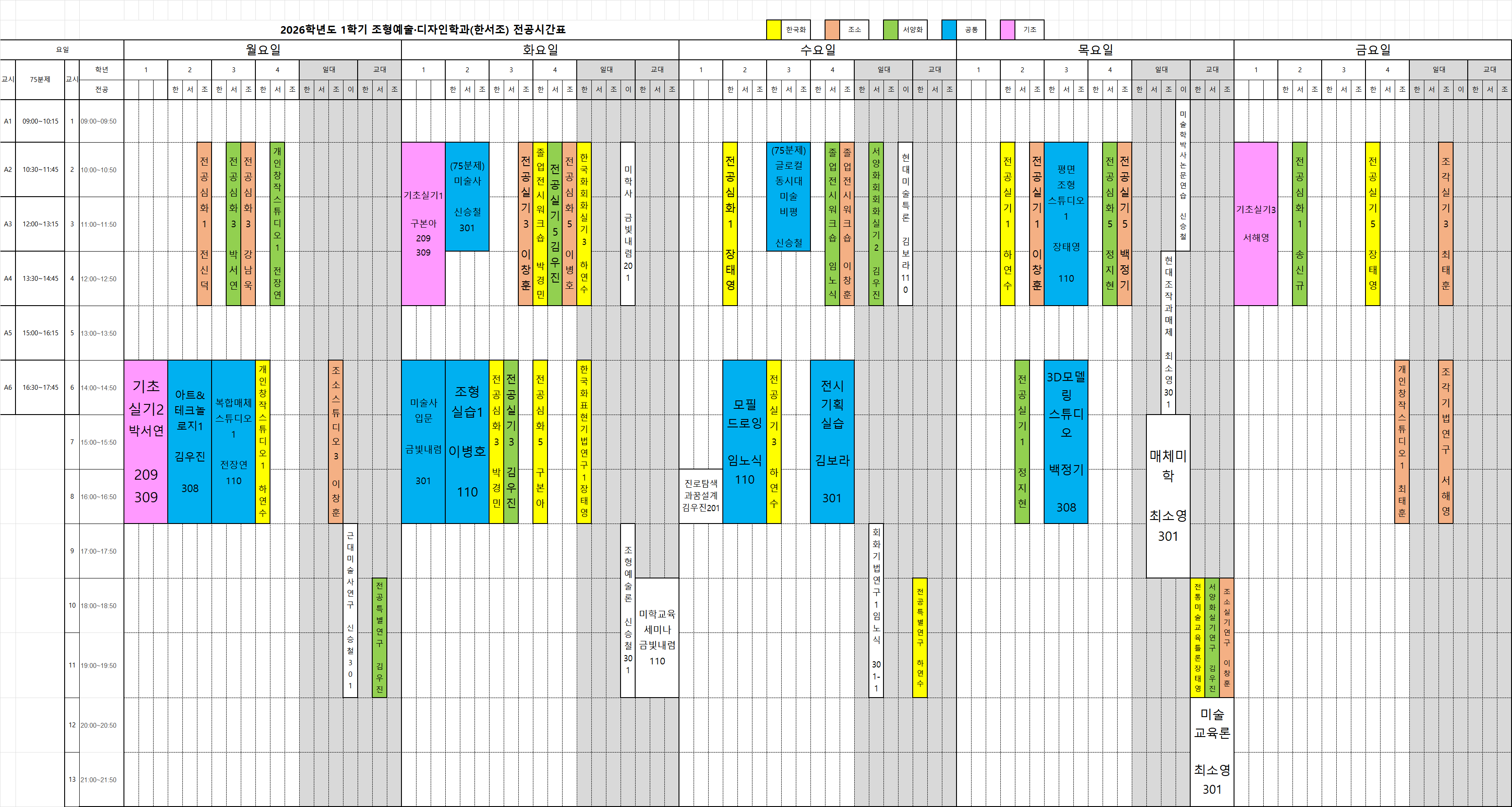 2026학년도 1학기 조형예술·디자인학과(한국화·서양화·조소전공) 시간표