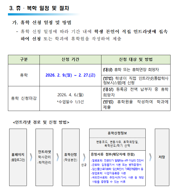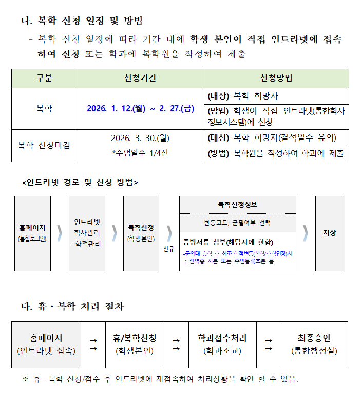 2026학년도 1학기 휴학, 복학 추진 계획