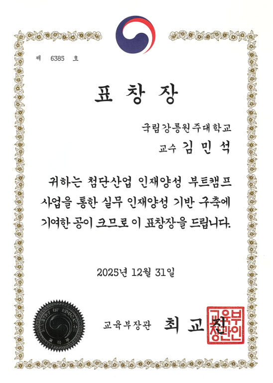 수학물리학부 물리·에너지전공 김민석 교수, '교육부장관 유공 표창 수상' (2025년 12월 31일)