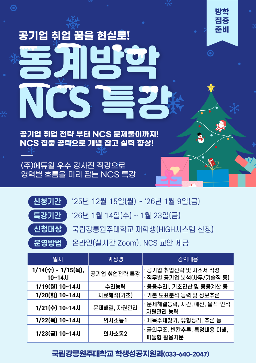 fnctId=bbs,fnctNo=871 [학생성공지원과] 동계방학 공기업 NCS 직업기초능력 향상 프로그램 작성일 2025.12.15 작성자 최지은 조회수 400 첨부파일 첨부파일이(가) 없습니다.
